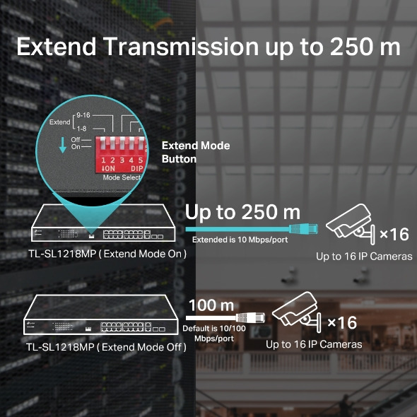 | Advanced Features | • Compatible With IEEE 802.3at/af Compliant PDs • Extend Mode (Up to 250m PoE power supply and data transmission) • Priority Mode (Ports 1-8) • Isolation Mode (Ports 1-16) • PoE Auto Recovery (Ports 1-16) • Mac Address Auto-Learning And Auto-Aging • IEEE802.3x Flow Control |